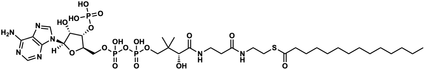 InChI=1S/C35H62N7O17P3S/c1-4-5-6-7-8-9-10-11-12-13-14-15-26(44)63-19-18-37-25(43)16-17-38-33(47)30(46)35(2,3)21-56-62(53,54)59-61(51,52)55-20-24-29(58-60(48,49)50)28(45)34(57-24)42-23-41-27-31(36)39-22-40-32(27)42/h22-24,28-30,34,45-46H,4-21H2,1-3H3,(H,37,43)(H,38,47)(H,51,52)(H,53,54)(H2,36,39,40)(H2,48,49,50)/t24-,28-,29-,30+,34-/m1/s1 |