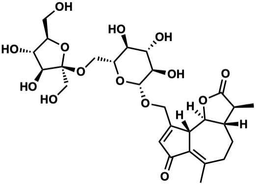 InChI=1S/C27H38O14/c1-10-3-4-13-11(2)25(36)40-23(13)18-12(5-14(30)17(10)18)7-37-26-22(34)21(33)19(31)16(39-26)8-38-27(9-29)24(35)20(32)15(6-28)41-27/h5,11,13,15-16,18-24,26,28-29,31-35H,3-4,6-9H2,1-2H3/t11-,13-,15+,16+,18-,19+,20+,21-,22+,23-,24-,26+,27+/m0/s1 |