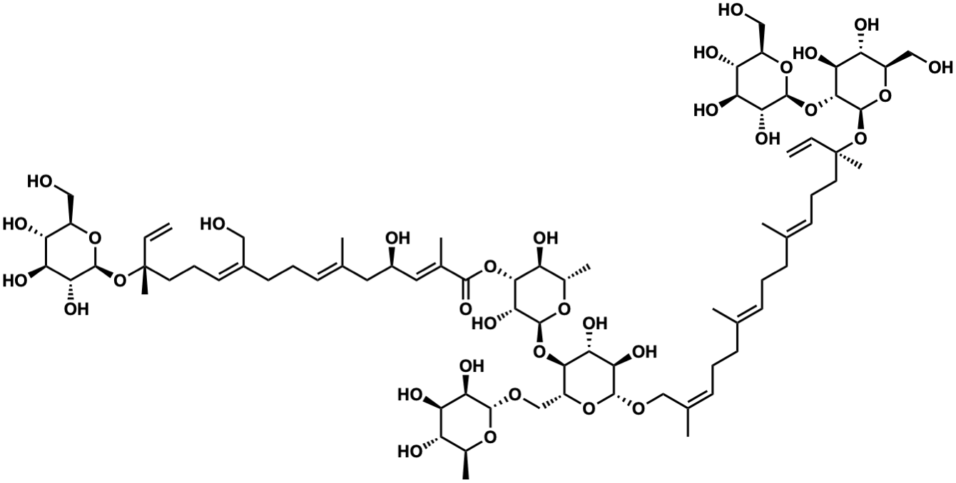 InChI=1S/C76H124O34/c1-12-75(10,109-73-62(94)57(89)53(85)47(33-79)103-73)28-18-26-44(31-77)25-16-22-39(5)29-45(81)30-41(7)68(97)106-66-51(83)43(9)101-72(64(66)96)107-65-49(36-99-69-60(92)55(87)50(82)42(8)100-69)105-70(63(95)59(65)91)98-35-40(6)23-15-21-37(3)19-14-20-38(4)24-17-27-76(11,13-2)110-74-67(58(90)54(86)48(34-80)104-74)108-71-61(93)56(88)52(84)46(32-78)102-71/h12-13,19,22-24,26,30,42-43,45-67,69-74,77-96H,1-2,14-18,20-21,25,27-29,31-36H2,3-11H3/b37-19+,38-24+,39-22+,40-23-,41-30+,44-26-/t42-,43-,45+,46+,47+,48+,49+,50-,51-,52+,53+,54+,55+,56-,57-,58-,59+,60+,61+,62+,63+,64+,65+,66+,67+,69+,70+,71-,72-,73-,74-,75+,76+/m0/s1 |