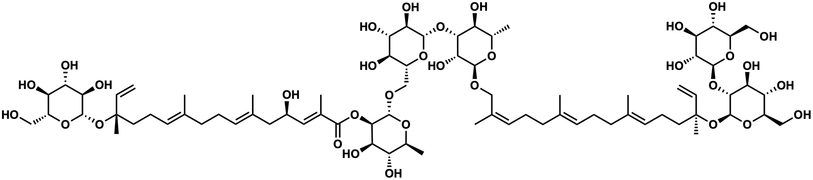 InChI=1S/C76H124O33/c1-13-75(11,108-72-63(94)57(88)53(84)47(33-78)102-72)28-18-26-39(5)22-16-24-40(6)30-45(80)31-42(8)68(96)105-66-59(90)50(81)43(9)100-73(66)98-36-49-55(86)58(89)62(93)71(104-49)106-65-51(82)44(10)99-69(64(65)95)97-35-41(7)25-17-23-37(3)20-15-21-38(4)27-19-29-76(12,14-2)109-74-67(60(91)54(85)48(34-79)103-74)107-70-61(92)56(87)52(83)46(32-77)101-70/h13-14,20,24-27,31,43-67,69-74,77-95H,1-2,15-19,21-23,28-30,32-36H2,3-12H3/b37-20+,38-27+,39-26+,40-24+,41-25-,42-31+/t43-,44-,45+,46+,47+,48+,49+,50-,51-,52+,53+,54+,55+,56-,57-,58-,59+,60-,61+,62+,63+,64+,65+,66+,67+,69+,70-,71-,72-,73+,74-,75+,76+/m0/s1 |