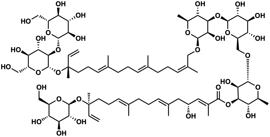InChI=1S/C76H124O33/c1-13-75(11,108-73-62(93)57(88)53(84)47(33-78)102-73)28-18-26-39(5)22-16-24-40(6)30-45(80)31-42(8)68(96)105-65-50(81)43(9)100-70(63(65)94)98-36-49-55(86)58(89)61(92)72(104-49)106-66-51(82)44(10)99-69(64(66)95)97-35-41(7)25-17-23-37(3)20-15-21-38(4)27-19-29-76(12,14-2)109-74-67(59(90)54(85)48(34-79)103-74)107-71-60(91)56(87)52(83)46(32-77)101-71/h13-14,20,24-27,31,43-67,69-74,77-95H,1-2,15-19,21-23,28-30,32-36H2,3-12H3/b37-20+,38-27+,39-26+,40-24+,41-25-,42-31+/t43-,44-,45+,46+,47+,48+,49+,50-,51-,52+,53+,54+,55+,56-,57-,58-,59-,60+,61+,62+,63+,64+,65+,66+,67+,69-,70+,71-,72-,73-,74-,75+,76+/m0/s1 |