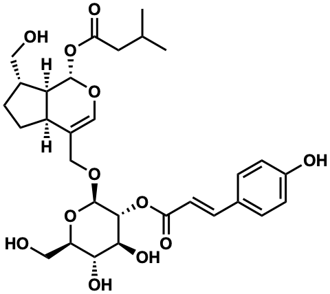 InChI=1S/C30H40O12/c1-16(2)11-24(35)42-29-25-18(12-31)6-9-21(25)19(14-38-29)15-39-30-28(27(37)26(36)22(13-32)40-30)41-23(34)10-5-17-3-7-20(33)8-4-17/h3-5,7-8,10,14,16,18,21-22,25-33,36-37H,6,9,11-13,15H2,1-2H3/b10-5+/t18-,21-,22-,25-,26-,27+,28-,29+,30-/m1/s1 |