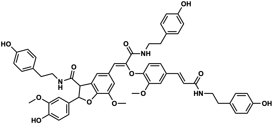 InChI=1S/C54H53N3O12/c1-65-45-32-38(12-19-43(45)61)51-50(54(64)57-27-24-35-8-17-41(60)18-9-35)42-28-37(30-47(67-3)52(42)69-51)31-48(53(63)56-26-23-34-6-15-40(59)16-7-34)68-44-20-10-36(29-46(44)66-2)11-21-49(62)55-25-22-33-4-13-39(58)14-5-33/h4-21,28-32,50-51,58-61H,22-27H2,1-3H3,(H,55,62)(H,56,63)(H,57,64)/b21-11+,48-31- |