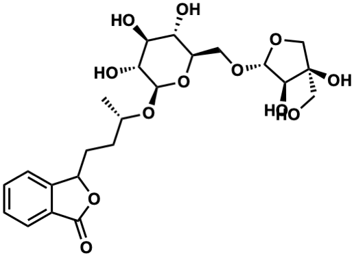 InChI=1S/C23H32O12/c1-11(6-7-14-12-4-2-3-5-13(12)20(29)34-14)33-21-18(27)17(26)16(25)15(35-21)8-31-22-19(28)23(30,9-24)10-32-22/h2-5,11,14-19,21-22,24-28,30H,6-10H2,1H3/t11-,14?,15+,16+,17-,18+,19-,21+,22+,23+/m0/s1 |