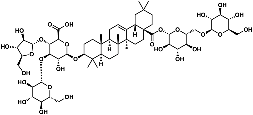 InChI=1S/C59H94O28/c1-54(2)14-16-59(53(77)87-51-42(73)38(69)35(66)28(82-51)22-78-48-40(71)36(67)32(63)25(19-60)79-48)17-15-57(6)23(24(59)18-54)8-9-30-56(5)12-11-31(55(3,4)29(56)10-13-58(30,57)7)83-52-43(74)44(84-50-41(72)37(68)33(64)26(20-61)80-50)45(46(86-52)47(75)76)85-49-39(70)34(65)27(21-62)81-49/h8,24-46,48-52,60-74H,9-22H2,1-7H3,(H,75,76)/t24-,25+,26+,27-,28+,29-,30+,31-,32+,33+,34-,35+,36-,37-,38-,39+,40+,41+,42+,43+,44+,45-,46-,48+,49-,50-,51-,52+,56-,57+,58+,59-/m0/s1 |