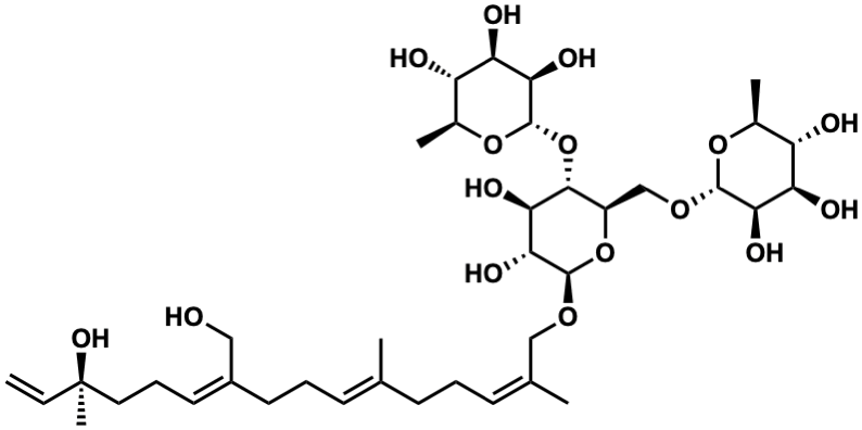 InChI=1S/C38H64O16/c1-7-38(6,48)16-10-15-24(17-39)14-9-12-20(2)11-8-13-21(3)18-49-36-33(47)30(44)34(54-37-32(46)29(43)27(41)23(5)52-37)25(53-36)19-50-35-31(45)28(42)26(40)22(4)51-35/h7,12-13,15,22-23,25-37,39-48H,1,8-11,14,16-19H2,2-6H3/b20-12+,21-13-,24-15-/t22-,23-,25+,26-,27-,28+,29+,30+,31+,32+,33+,34+,35+,36+,37-,38+/m0/s1 |