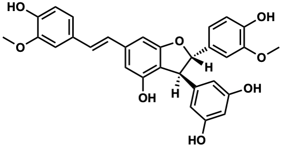 InChI=1S/C30H26O8/c1-36-25-10-16(5-7-22(25)33)3-4-17-9-24(35)29-27(11-17)38-30(18-6-8-23(34)26(14-18)37-2)28(29)19-12-20(31)15-21(32)13-19/h3-15,28,30-35H,1-2H3/b4-3+/t28-,30+/m0/s1 |