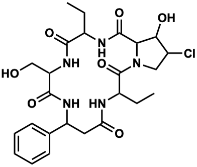 CCC1NC(=O)C2C(O)C(Cl)CN2C(=O)C(CC)NC(=O)CC(c2ccccc2)NC(=O)C(CO)NC1=O |