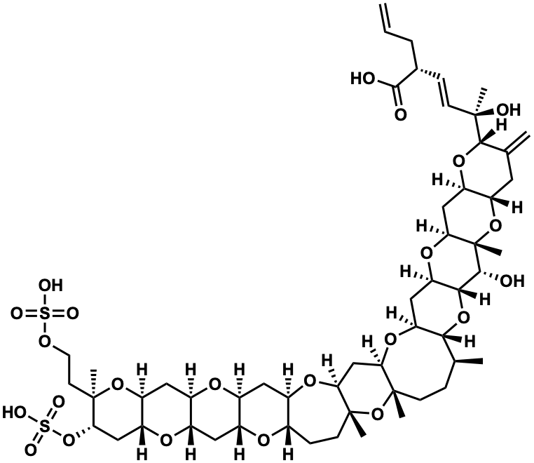 InChI=1S/C55H82O23S2/c1-9-10-29(50(57)58)12-14-51(4,59)49-28(3)19-38-37(73-49)25-45-55(8,76-38)48(56)47-41(72-45)23-40-46(74-47)27(2)11-15-53(6)43(71-40)26-42-54(7,78-53)16-13-30-31(70-42)20-33-32(67-30)21-34-35(68-33)22-39-36(69-34)24-44(77-80(63,64)65)52(5,75-39)17-18-66-79(60,61)62/h9,12,14,27,29-49,56,59H,1,3,10-11,13,15-26H2,2,4-8H3,(H,57,58)(H,60,61,62)(H,63,64,65)/b14-12+/t27-,29+,30-,31+,32+,33-,34-,35+,36+,37+,38-,39-,40-,41+,42-,43+,44-,45-,46+,47+,48+,49-,51+,52+,53-,54+,55-/m0/s1 |