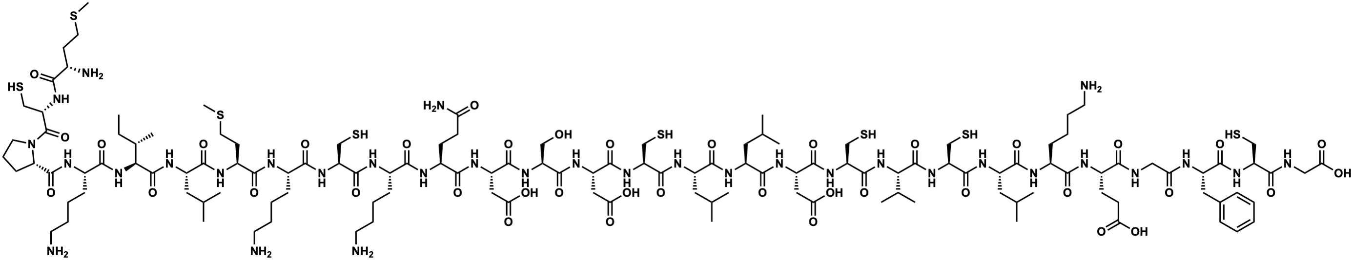 InChI=1S/C130H219N33O39S8/c1-15-70(12)104(162-113(185)76(33-22-26-44-134)146-127(199)95-34-27-45-163(95)130(202)94(64-208)160-105(177)72(135)39-46-209-13)129(201)153-83(51-68(8)9)115(187)145-79(40-47-210-14)112(184)140-75(32-21-25-43-133)110(182)156-90(60-204)123(195)142-74(31-20-24-42-132)109(181)144-78(35-37-96(136)165)111(183)150-85(53-99(169)170)119(191)154-88(58-164)122(194)152-87(55-101(173)174)121(193)157-91(61-205)124(196)149-82(50-67(6)7)116(188)147-81(49-66(4)5)117(189)151-86(54-100(171)172)120(192)158-93(63-207)126(198)161-103(69(10)11)128(200)159-92(62-206)125(197)148-80(48-65(2)3)114(186)141-73(30-19-23-41-131)108(180)143-77(36-38-98(167)168)106(178)137-56-97(166)139-84(52-71-28-17-16-18-29-71)118(190)155-89(59-203)107(179)138-57-102(175)176/h16-18,28-29,65-70,72-95,103-104,164,203-208H,15,19-27,30-64,131-135H2,1-14H3,(H2,136,165)(H,137,178)(H,138,179)(H,139,166)(H,140,184)(H,141,186)(H,142,195)(H,143,180)(H,144,181)(H,145,187)(H,146,199)(H,147,188)(H,148,197)(H,149,196)(H,150,183)(H,151,189)(H,152,194)(H,153,201)(H,154,191)(H,155,190)(H,156,182)(H,157,193)(H,158,192)(H,159,200)(H,160,177)(H,161,198)(H,162,185)(H,167,168)(H,169,170)(H,171,172)(H,173,174)(H,175,176)/t70-,72-,73-,74-,75-,76-,77-,78-,79-,80-,81-,82-,83-,84-,85-,86-,87-,88-,89-,90-,91-,92-,93-,94-,95-,103-,104-/m0/s1 |