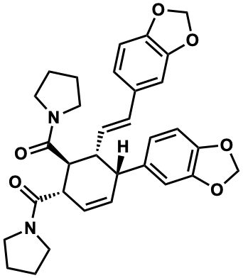 InChI=1S/C32H34N2O6/c35-31(33-13-1-2-14-33)25-10-9-23(22-7-12-27-29(18-22)40-20-38-27)24(30(25)32(36)34-15-3-4-16-34)8-5-21-6-11-26-28(17-21)39-19-37-26/h5-12,17-18,23-25,30H,1-4,13-16,19-20H2/b8-5+/t23-,24+,25-,30-/m0/s1 |