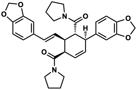 InChI=1S/C32H34N2O6/c35-31(33-13-1-2-14-33)25-10-9-23(22-7-12-27-29(18-22)40-20-38-27)30(32(36)34-15-3-4-16-34)24(25)8-5-21-6-11-26-28(17-21)39-19-37-26/h5-12,17-18,23-25,30H,1-4,13-16,19-20H2/b8-5+/t23-,24-,25-,30-/m1/s1 |