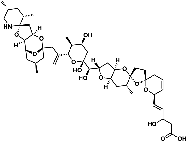 InChI=1S/C46H69NO14/c1-24-15-35-40-37(22-44(59-40)27(4)14-25(2)23-47-44)57-43(19-24,56-35)20-26(3)39-29(6)32(49)21-45(53,60-39)41(52)36-18-34-33(54-36)16-28(5)46(58-34)13-12-42(61-46)11-7-8-31(55-42)10-9-30(48)17-38(50)51/h7-10,24-25,27-37,39-41,47-49,52-53H,3,11-23H2,1-2,4-6H3,(H,50,51)/b10-9+/t24-,25+,27-,28+,29-,30?,31-,32-,33+,34+,35+,36-,37+,39+,40+,41+,42-,43-,44-,45+,46+/m0/s1 |