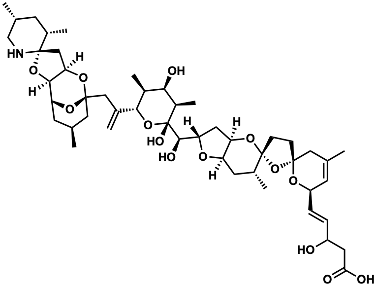 InChI=1S/C48H73NO14/c1-24-14-33(10-9-32(50)17-39(51)52)57-44(19-24)11-12-47(63-44)29(6)16-34-35(60-47)18-37(56-34)43(54)48(55)31(8)40(53)30(7)41(62-48)27(4)21-45-20-25(2)15-36(58-45)42-38(59-45)22-46(61-42)28(5)13-26(3)23-49-46/h9-10,14,25-26,28-38,40-43,49-50,53-55H,4,11-13,15-23H2,1-3,5-8H3,(H,51,52)/b10-9+/t25-,26+,28-,29+,30-,31+,32?,33+,34+,35+,36+,37-,38+,40+,41+,42+,43+,44+,45-,46-,47+,48+/m0/s1 |