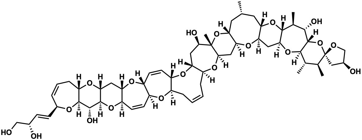 InChI=1S/C60H86O19/c1-28-19-42-44(22-48-54(76-42)30(3)52(65)58-55(77-48)29(2)31(4)60(79-58)25-33(63)27-67-60)73-46-24-51-59(5,78-47(46)20-28)50(64)23-45-36(74-51)11-7-6-10-35-37(71-45)15-16-39-38(69-35)17-18-40-43(70-39)21-49-57(75-40)53(66)56-41(72-49)12-8-9-34(68-56)14-13-32(62)26-61/h6-9,13-18,28-58,61-66H,10-12,19-27H2,1-5H3/b7-6-,14-13+/t28-,29+,30+,31+,32+,33+,34-,35-,36+,37+,38+,39-,40-,41+,42+,43+,44-,45-,46+,47-,48+,49-,50-,51-,52+,53-,54-,55-,56+,57-,58+,59+,60-/m1/s1 |