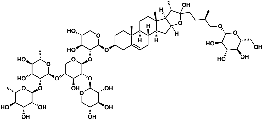 InChI=1S/C60H98O29/c1-22(18-77-52-47(74)44(71)41(68)34(17-61)84-52)9-14-60(76)23(2)36-33(89-60)16-30-28-8-7-26-15-27(10-12-58(26,5)29(28)11-13-59(30,36)6)83-55-49(40(67)32(63)20-79-55)88-56-50(86-53-46(73)39(66)31(62)19-78-53)42(69)35(21-80-56)85-57-51(45(72)38(65)25(4)82-57)87-54-48(75)43(70)37(64)24(3)81-54/h7,22-25,27-57,61-76H,8-21H2,1-6H3/t22-,23+,24+,25+,27+,28-,29+,30+,31-,32-,33+,34-,35-,36+,37+,38+,39+,40+,41-,42+,43-,44+,45-,46-,47-,48-,49-,50-,51-,52-,53+,54+,55+,56+,57+,58+,59+,60?/m1/s1 |