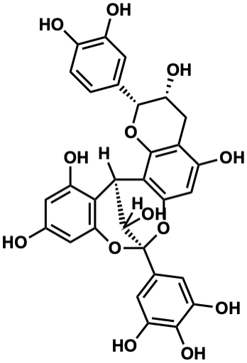 InChI=1S/C30H24O13/c31-12-6-17(35)23-21(7-12)42-30(11-4-18(36)26(39)19(37)5-11)29(40)25(23)24-22(43-30)9-15(33)13-8-20(38)27(41-28(13)24)10-1-2-14(32)16(34)3-10/h1-7,9,20,25,27,29,31-40H,8H2/t20-,25+,27-,29?,30-/m1/s1 |