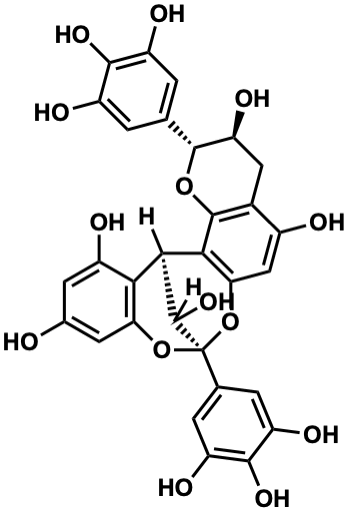 InChI=1S/C30H24O14/c31-11-5-14(33)22-20(6-11)43-30(10-3-17(36)26(40)18(37)4-10)29(41)24(22)23-21(44-30)8-13(32)12-7-19(38)27(42-28(12)23)9-1-15(34)25(39)16(35)2-9/h1-6,8,19,24,27,29,31-41H,7H2/t19-,24-,27+,29?,30+/m0/s1 |