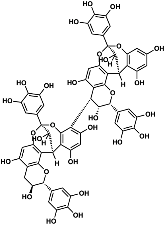 InChI=1S/C60H46O28/c61-19-9-22(63)38-35(10-19)85-59(17-5-30(71)49(78)31(72)6-17)57(81)45(38)43-37(86-59)14-25(66)39-44(51(80)53(84-55(39)43)16-3-28(69)48(77)29(70)4-16)40-23(64)12-24(65)41-46-42-36(87-60(58(46)82,88-56(40)41)18-7-32(73)50(79)33(74)8-18)13-21(62)20-11-34(75)52(83-54(20)42)15-1-26(67)47(76)27(68)2-15/h1-10,12-14,34,44-46,51-53,57-58,61-82H,11H2/t34-,44-,45-,46-,51+,52+,53+,57?,58?,59+,60-/m0/s1 |