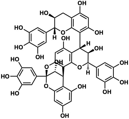 InChI=1S/C45H36O21/c46-15-7-18(48)30-28(8-15)65-45(14-5-25(55)38(60)26(56)6-14)44(62)35(30)33-29(66-45)11-20(50)32-34(39(61)41(64-43(32)33)13-3-23(53)37(59)24(54)4-13)31-19(49)10-17(47)16-9-27(57)40(63-42(16)31)12-1-21(51)36(58)22(52)2-12/h1-8,10-11,27,34-35,39-41,44,46-62H,9H2/t27-,34-,35+,39+,40+,41+,44+,45-/m0/s1 |