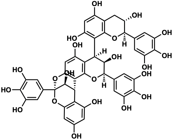 InChI=1S/C45H36O21/c46-15-7-18(48)30-28(8-15)65-45(14-5-25(55)38(60)26(56)6-14)44(62)35(30)33-29(66-45)11-20(50)32-34(39(61)41(64-43(32)33)13-3-23(53)37(59)24(54)4-13)31-19(49)10-17(47)16-9-27(57)40(63-42(16)31)12-1-21(51)36(58)22(52)2-12/h1-8,10-11,27,34-35,39-41,44,46-62H,9H2/t27-,34+,35-,39+,40+,41+,44-,45+/m0/s1 |