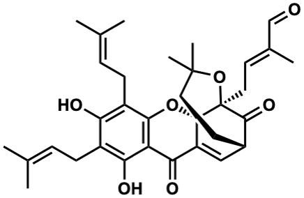 CC(C)=CCc1c(O)c(CC=C(C)C)c2c(c1O)C(=O)C1=C[C@@H]3C[C@H]4C(C)(C)O[C@@](C/C=C(C)C=O)(C3=O)[C@@]14O2 |