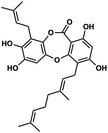 CC(C)=CCC/C(C)=C/Cc1c(O)cc(O)c2c1Oc1cc(O)c(O)c(CC=C(C)C)c1OC2=O |