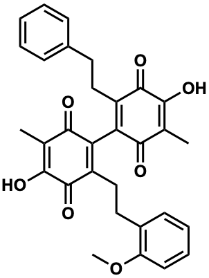 InChI=1S/C31H28O7/c1-17-26(32)24(21(30(36)28(17)34)15-13-19-9-5-4-6-10-19)25-22(31(37)29(35)18(2)27(25)33)16-14-20-11-7-8-12-23(20)38-3/h4-12,34-35H,13-16H2,1-3H3 |