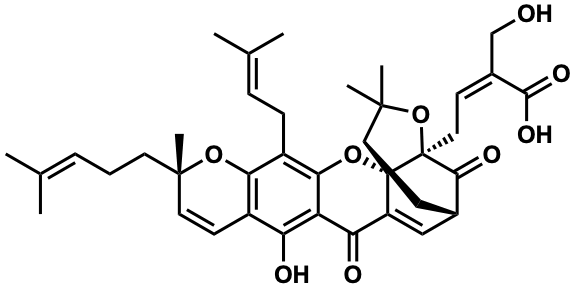 InChI=1S/C38H44O9/c1-20(2)9-8-14-36(7)15-13-24-29(40)28-30(41)26-17-23-18-27-35(5,6)47-37(33(23)42,16-12-22(19-39)34(43)44)38(26,27)46-32(28)25(31(24)45-36)11-10-21(3)4/h9-10,12-13,15,17,23,27,39-40H,8,11,14,16,18-19H2,1-7H3,(H,43,44)/b22-12-/t23-,27+,36+,37+,38-/m1/s1 |
