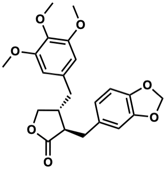InChI=1S/C22H24O7/c1-24-19-9-14(10-20(25-2)21(19)26-3)6-15-11-27-22(23)16(15)7-13-4-5-17-18(8-13)29-12-28-17/h4-5,8-10,15-16H,6-7,11-12H2,1-3H3/t15-,16+/m0/s1 |