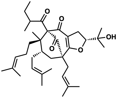 InChI=1S/C36H54O5/c1-12-25(8)29(37)36-30(38)27-20-28(33(9,10)40)41-31(27)35(32(36)39,19-17-24(6)7)21-26(16-15-23(4)5)34(36,11)18-13-14-22(2)3/h14-15,17,25-26,28,40H,12-13,16,18-21H2,1-11H3/t25?,26-,28+,34+,35+,36-/m0/s1 |