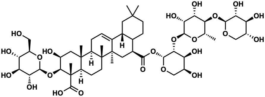 InChI=1S/C52H82O23/c1-20-39(72-43-36(62)31(57)26(55)18-68-43)35(61)38(64)44(70-20)73-40-32(58)27(56)19-69-46(40)75-42(65)23-15-51(6)24(22-14-48(2,3)12-10-21(22)23)8-9-29-49(4)16-25(54)41(52(7,47(66)67)30(49)11-13-50(29,51)5)74-45-37(63)34(60)33(59)28(17-53)71-45/h8,20-23,25-41,43-46,53-64H,9-19H2,1-7H3,(H,66,67)/t20-,21?,22+,23-,25-,26+,27-,28+,29+,30+,31-,32-,33+,34-,35-,36+,37+,38+,39-,40+,41-,43-,44-,45-,46+,49+,50+,51+,52-/m0/s1 |
