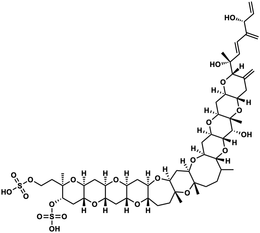 InChI=1S/C55H82O22S2/c1-10-30(56)27(2)11-14-51(5,58)50-29(4)19-39-38(72-50)25-46-55(9,75-39)49(57)48-42(71-46)23-41-47(73-48)28(3)12-15-53(7)44(70-41)26-43-54(8,77-53)16-13-31-32(69-43)20-34-33(66-31)21-35-36(67-34)22-40-37(68-35)24-45(76-79(62,63)64)52(6,74-40)17-18-65-78(59,60)61/h10-11,14,28,30-50,56-58H,1-2,4,12-13,15-26H2,3,5-9H3,(H,59,60,61)(H,62,63,64)/b14-11+/t28?,30-,31+,32-,33-,34+,35+,36-,37-,38-,39+,40+,41+,42-,43+,44-,45+,46+,47-,48-,49-,50+,51-,52-,53+,54-,55+/m1/s1 |