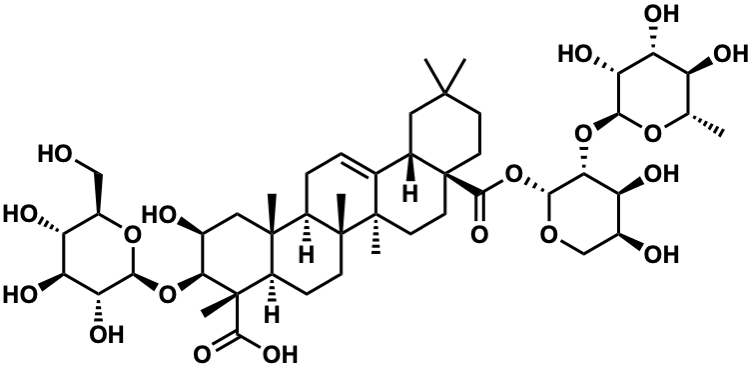 InChI=1S/C47H74O19/c1-20-28(51)31(54)33(56)37(62-20)64-35-29(52)24(50)19-61-39(35)66-41(60)47-14-12-42(2,3)16-22(47)21-8-9-26-43(4)17-23(49)36(65-38-34(57)32(55)30(53)25(18-48)63-38)46(7,40(58)59)27(43)10-11-45(26,6)44(21,5)13-15-47/h8,20,22-39,48-57H,9-19H2,1-7H3,(H,58,59)/t20-,22-,23-,24-,25+,26+,27+,28-,29-,30+,31+,32-,33+,34+,35+,36-,37-,38-,39+,43+,44+,45+,46-,47-/m0/s1 |