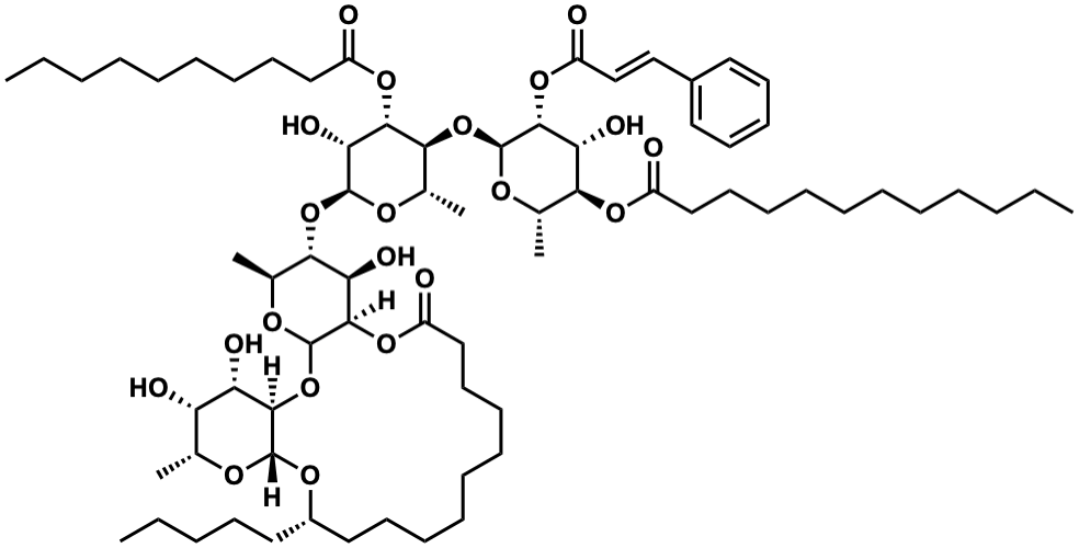 InChI=1S/C71H116O21/c1-8-11-14-16-18-19-23-27-34-41-52(72)86-61-47(5)83-70(66(58(61)78)89-55(75)45-44-50-37-31-29-32-38-50)91-63-49(7)82-68(60(80)64(63)87-53(73)42-35-26-21-17-15-12-9-2)90-62-48(6)84-71-67(59(62)79)88-54(74)43-36-28-24-20-22-25-33-40-51(39-30-13-10-3)85-69-65(92-71)57(77)56(76)46(4)81-69/h29,31-32,37-38,44-49,51,56-71,76-80H,8-28,30,33-36,39-43H2,1-7H3/b45-44+/t46-,47+,48+,49+,51+,56+,57+,58-,59-,60-,61+,62+,63+,64+,65-,66-,67-,68+,69+,70+,71?/m1/s1 |
