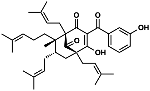 InChI=1S/C38H50O5/c1-24(2)12-11-19-36(9)29(16-15-25(3)4)23-37(20-17-26(5)6)33(41)31(32(40)28-13-10-14-30(39)22-28)34(42)38(36,35(37)43)21-18-27(7)8/h10,12-15,17-18,22,29,39,41H,11,16,19-21,23H2,1-9H3/t29-,36-,37-,38+/m0/s1 |