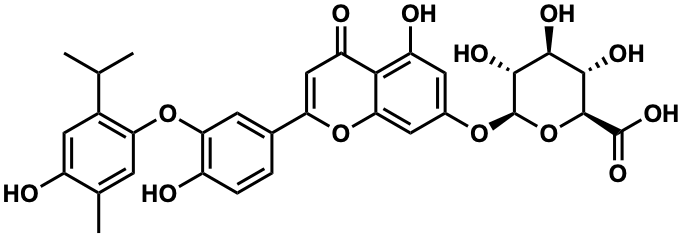 Cc1cc(Oc2cc(-c3cc(=O)c4c(O)cc(O[C@@H]5O[C@H](C(=O)O)[C@@H](O)[C@H](O)[C@H]5O)cc4o3)ccc2O)c(C(C)C)cc1O |