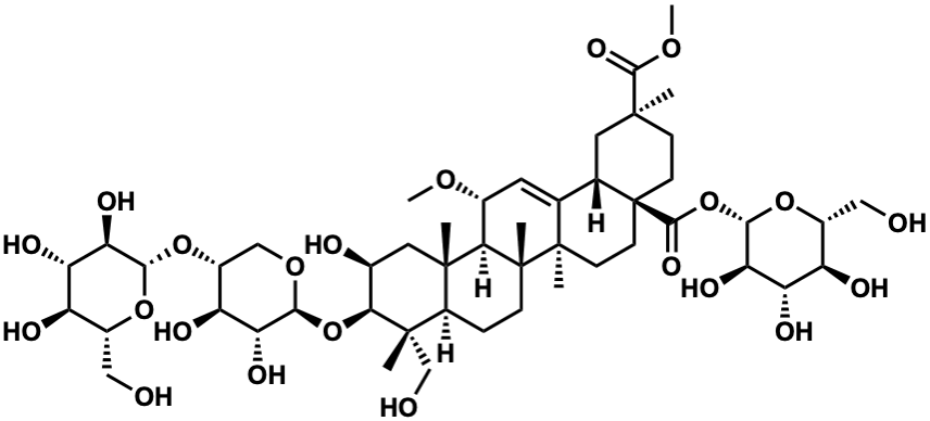 InChI=1S/C49H78O22/c1-44(42(62)65-7)10-12-49(43(63)71-41-36(61)33(58)30(55)26(18-51)68-41)13-11-47(4)21(22(49)15-44)14-24(64-6)37-45(2)16-23(53)38(46(3,20-52)28(45)8-9-48(37,47)5)70-39-34(59)31(56)27(19-66-39)69-40-35(60)32(57)29(54)25(17-50)67-40/h14,22-41,50-61H,8-13,15-20H2,1-7H3/t22-,23-,24+,25+,26+,27+,28+,29+,30+,31-,32-,33-,34+,35+,36+,37+,38-,39-,40-,41-,44-,45-,46-,47+,48+,49-/m0/s1 |
