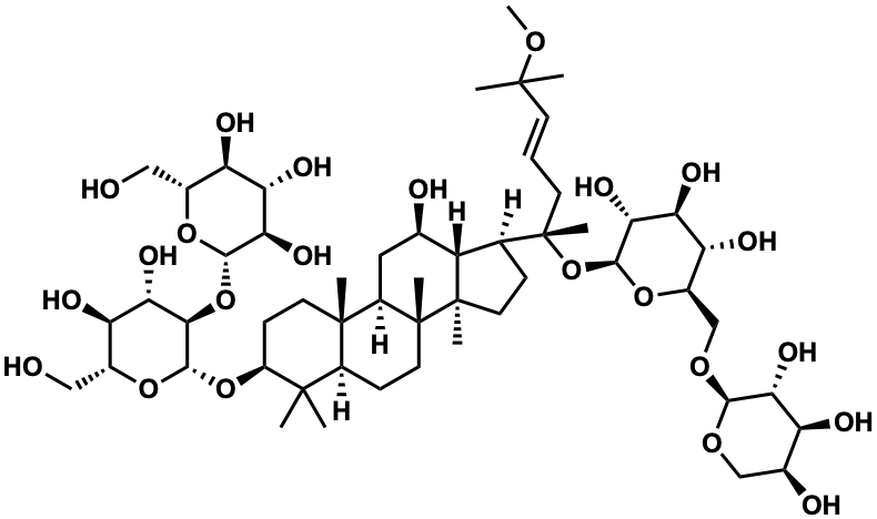 InChI=1S/C54H92O23/c1-49(2,69-9)14-10-15-54(8,77-47-43(68)39(64)37(62)29(74-47)23-71-45-41(66)34(59)26(58)22-70-45)24-11-17-53(7)33(24)25(57)19-31-51(5)16-13-32(50(3,4)30(51)12-18-52(31,53)6)75-48-44(40(65)36(61)28(21-56)73-48)76-46-42(67)38(63)35(60)27(20-55)72-46/h10,14,24-48,55-68H,11-13,15-23H2,1-9H3/b14-10+/t24-,25+,26-,27+,28+,29+,30-,31+,32-,33-,34-,35+,36+,37+,38-,39-,40-,41+,42+,43+,44+,45-,46-,47-,48-,51-,52+,53+,54-/m0/s1 |