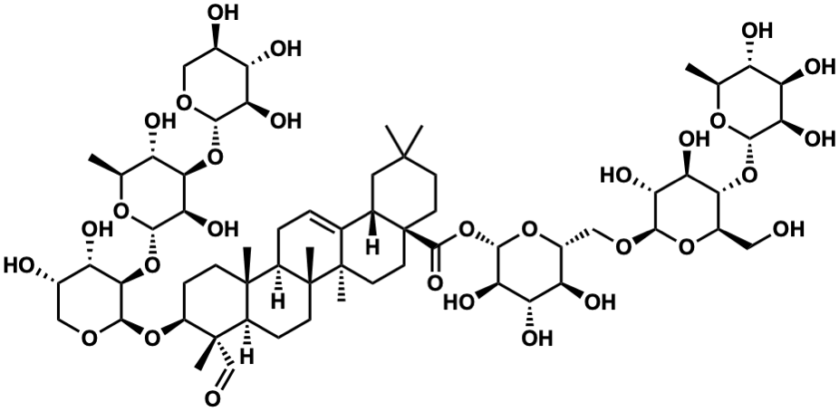 InChI=1S/C64H102O30/c1-25-36(69)41(74)45(78)54(86-25)91-49-31(20-65)88-52(47(80)43(49)76)85-23-32-40(73)42(75)46(79)55(89-32)94-58(82)64-17-15-59(3,4)19-28(64)27-9-10-34-60(5)13-12-35(61(6,24-66)33(60)11-14-63(34,8)62(27,7)16-18-64)90-57-51(39(72)30(68)22-84-57)93-56-48(81)50(37(70)26(2)87-56)92-53-44(77)38(71)29(67)21-83-53/h9,24-26,28-57,65,67-81H,10-23H2,1-8H3/t25-,26-,28-,29+,30-,31+,32+,33+,34+,35-,36-,37-,38-,39-,40+,41+,42-,43+,44+,45+,46+,47+,48+,49+,50+,51+,52+,53-,54-,55-,56-,57+,60-,61-,62+,63+,64-/m0/s1 |