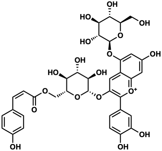 InChI=1S/C36H36O18/c37-13-25-28(43)30(45)32(47)35(53-25)51-23-11-18(39)10-22-19(23)12-24(34(50-22)16-4-7-20(40)21(41)9-16)52-36-33(48)31(46)29(44)26(54-36)14-49-27(42)8-3-15-1-5-17(38)6-2-15/h1-12,25-26,28-33,35-37,43-48H,13-14H2,(H3-,38,39,40,41,42)/p+1/t25-,26-,28-,29-,30+,31+,32-,33-,35-,36-/m1/s1 |