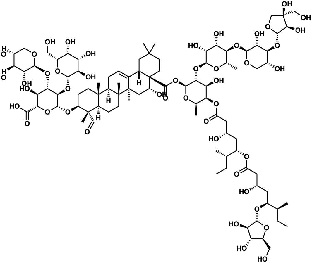 InChI=1S/C92H148O46/c1-13-36(3)46(126-54(102)25-41(98)24-47(37(4)14-2)127-80-62(110)58(106)49(30-94)128-80)23-40(97)26-55(103)131-69-39(6)125-82(73(65(69)113)136-79-64(112)60(108)68(38(5)124-79)132-78-67(115)70(45(100)32-122-78)133-84-75(116)91(120,34-96)35-123-84)138-85(119)92-22-21-86(7,8)27-43(92)42-15-16-51-87(9)19-18-53(88(10,33-95)50(87)17-20-89(51,11)90(42,12)28-52(92)101)130-83-74(137-81-63(111)59(107)57(105)48(29-93)129-81)71(66(114)72(135-83)76(117)118)134-77-61(109)56(104)44(99)31-121-77/h15,33,36-41,43-53,56-75,77-84,93-94,96-101,104-116,120H,13-14,16-32,34-35H2,1-12H3,(H,117,118)/t36-,37-,38-,39+,40-,41-,43-,44+,45+,46-,47-,48+,49-,50+,51+,52+,53-,56-,57-,58-,59-,60-,61+,62+,63+,64+,65-,66-,67+,68-,69-,70-,71-,72-,73+,74+,75-,77-,78-,79-,80+,81-,82-,83+,84-,87-,88-,89+,90+,91+,92+/m0/s1 |