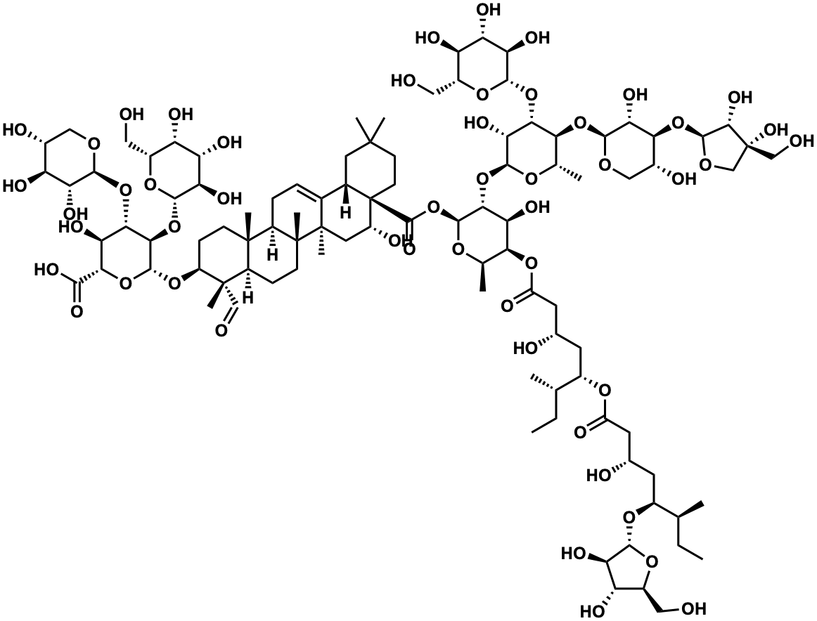 InChI=1S/C98H158O51/c1-13-37(3)47(135-56(109)25-42(105)24-48(38(4)14-2)136-84-65(118)61(114)51(31-101)137-84)23-41(104)26-57(110)141-72-39(5)134-88(78(68(72)121)147-87-71(124)76(145-85-66(119)62(115)59(112)49(29-99)138-85)73(40(6)133-87)142-83-70(123)74(46(107)33-131-83)143-90-80(125)97(129,35-103)36-132-90)149-91(128)98-22-21-92(7,8)27-44(98)43-15-16-53-93(9)19-18-55(94(10,34-102)52(93)17-20-95(53,11)96(43,12)28-54(98)108)140-89-79(148-86-67(120)63(116)60(113)50(30-100)139-86)75(69(122)77(146-89)81(126)127)144-82-64(117)58(111)45(106)32-130-82/h15,34,37-42,44-55,58-80,82-90,99-101,103-108,111-125,129H,13-14,16-33,35-36H2,1-12H3,(H,126,127)/t37-,38-,39+,40-,41-,42-,44-,45+,46+,47-,48-,49+,50+,51-,52+,53+,54+,55-,58-,59+,60-,61-,62-,63-,64+,65+,66+,67+,68-,69-,70+,71+,72-,73-,74-,75-,76-,77-,78+,79+,80-,82-,83-,84+,85-,86-,87-,88-,89+,90-,93-,94-,95+,96+,97+,98+/m0/s1 |