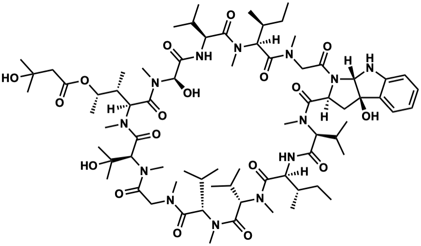 InChI=1S/C74H123N13O18/c1-28-42(11)53-64(95)82(23)56(41(9)10)67(98)83(24)55(40(7)8)65(96)78(19)36-49(88)80(21)59(73(17,18)103)69(100)85(26)58(44(13)45(14)105-51(90)35-72(15,16)102)68(99)86(27)70(101)61(92)76-52(38(3)4)63(94)84(25)57(43(12)29-2)66(97)79(20)37-50(89)87-48(62(93)81(22)54(39(5)6)60(91)77-53)34-74(104)46-32-30-31-33-47(46)75-71(74)87/h30-33,38-45,48,52-59,70-71,75,101-104H,28-29,34-37H2,1-27H3,(H,76,92)(H,77,91)/t42-,43-,44-,45-,48-,52-,53-,54-,55-,56-,57-,58-,59+,70+,71-,74+/m0/s1 |