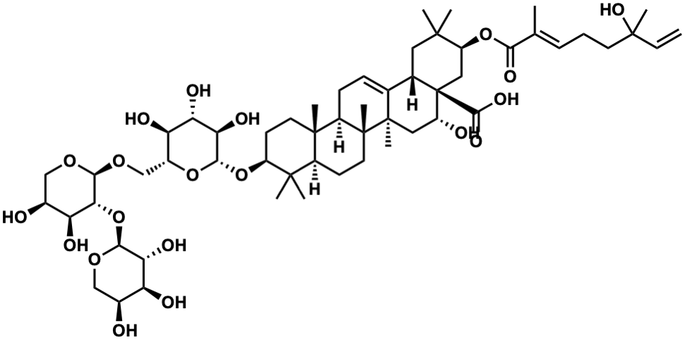 InChI=1S/C56H88O20/c1-11-52(7,69)18-12-13-27(2)45(66)74-37-23-56(49(67)68)29(21-50(37,3)4)28-14-15-34-53(8)19-17-36(51(5,6)33(53)16-20-54(34,9)55(28,10)22-35(56)59)75-47-43(65)41(63)40(62)32(73-47)26-72-48-44(39(61)31(58)25-71-48)76-46-42(64)38(60)30(57)24-70-46/h11,13-14,29-44,46-48,57-65,69H,1,12,15-26H2,2-10H3,(H,67,68)/b27-13+/t29-,30-,31-,32+,33-,34+,35+,36-,37-,38-,39-,40+,41-,42+,43+,44+,46-,47-,48-,52?,53-,54+,55+,56+/m0/s1 |
