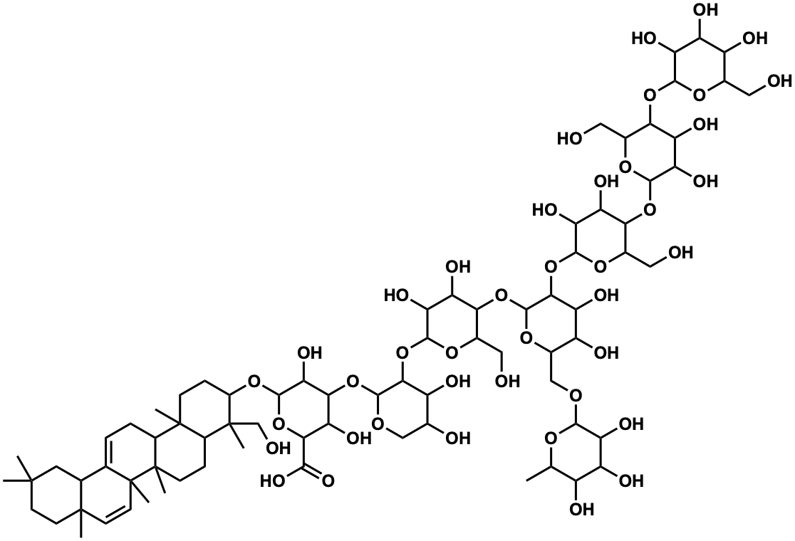 InChI=1S/C77H124O41/c1-27-39(84)43(88)49(94)64(105-27)104-25-35-42(87)45(90)62(118-68-52(97)47(92)57(33(22-80)108-68)113-66-51(96)46(91)56(32(21-79)107-66)112-65-50(95)44(89)41(86)31(20-78)106-65)71(110-35)114-58-34(23-81)109-67(53(98)48(58)93)117-61-40(85)30(83)24-103-70(61)115-59-54(99)60(63(101)102)116-69(55(59)100)111-38-12-13-74(5)36(75(38,6)26-82)11-14-77(8)37(74)10-9-28-29-19-72(2,3)15-16-73(29,4)17-18-76(28,77)7/h9,17-18,27,29-62,64-71,78-100H,10-16,19-26H2,1-8H3,(H,101,102) |