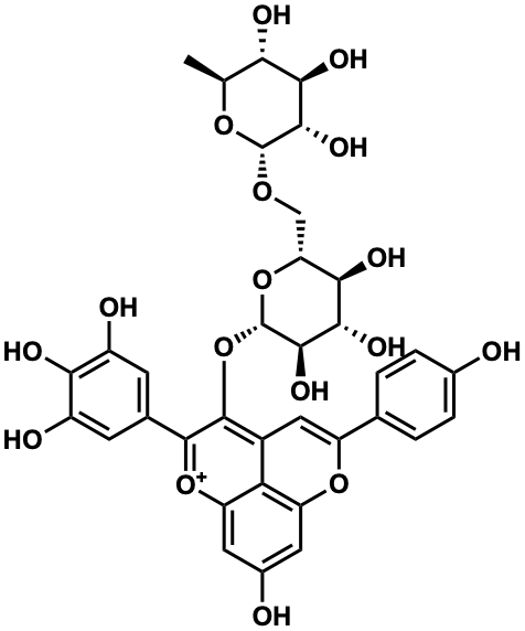 InChI=1S/C35H34O17/c1-12-25(40)28(43)30(45)34(48-12)47-11-23-27(42)29(44)31(46)35(51-23)52-33-17-10-20(13-2-4-15(36)5-3-13)49-21-8-16(37)9-22(24(17)21)50-32(33)14-6-18(38)26(41)19(39)7-14/h2-10,12,23,25,27-31,34-35,40,42-46H,11H2,1H3,(H4-,36,37,38,39,41)/p+1/t12-,23+,25-,27+,28+,29-,30-,31+,34+,35-/m0/s1 |