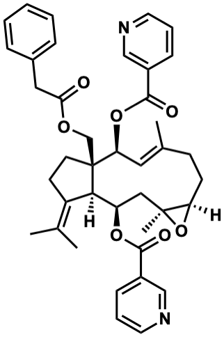 InChI=1S/C40H44N2O7/c1-26(2)31-16-17-40(25-46-35(43)21-28-10-6-5-7-11-28)34(48-38(45)30-13-9-19-42-24-30)20-27(3)14-15-33-39(4,49-33)22-32(36(31)40)47-37(44)29-12-8-18-41-23-29/h5-13,18-20,23-24,32-34,36H,14-17,21-22,25H2,1-4H3/b27-20+/t32-,33-,34+,36-,39+,40+/m1/s1 |