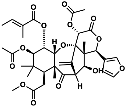 InChI=1S/C36H44O14/c1-11-16(2)31(42)48-24-28(46-18(4)37)33(6,7)21(14-22(39)44-10)34(8)25(40)23-17(3)36(50-29(24)34)30(47-19(5)38)32(43)49-27(20-12-13-45-15-20)35(36,9)26(23)41/h11-13,15,21,23-24,26-30,41H,3,14H2,1-2,4-10H3/b16-11+/t21-,23-,24-,26-,27-,28-,29-,30+,34-,35-,36+/m0/s1 |