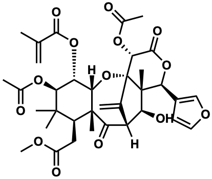 InChI=1S/C35H42O14/c1-15(2)30(41)47-23-27(45-17(4)36)32(6,7)20(13-21(38)43-10)33(8)24(39)22-16(3)35(49-28(23)33)29(46-18(5)37)31(42)48-26(19-11-12-44-14-19)34(35,9)25(22)40/h11-12,14,20,22-23,25-29,40H,1,3,13H2,2,4-10H3/t20-,22-,23-,25-,26-,27-,28-,29+,33-,34-,35+/m0/s1 |